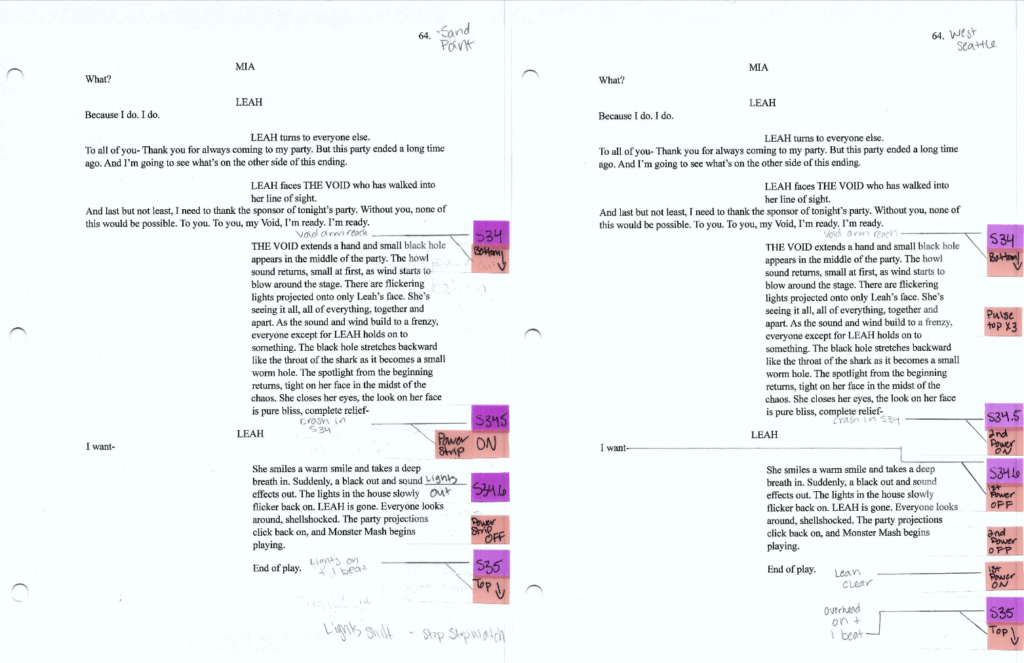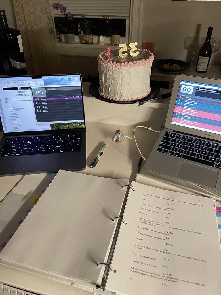 At the second house, I was in the kitchen, down a short hallway from the playing space without a way to see the actors. For the final scene of the show, I moved to second hallway to control the lights.